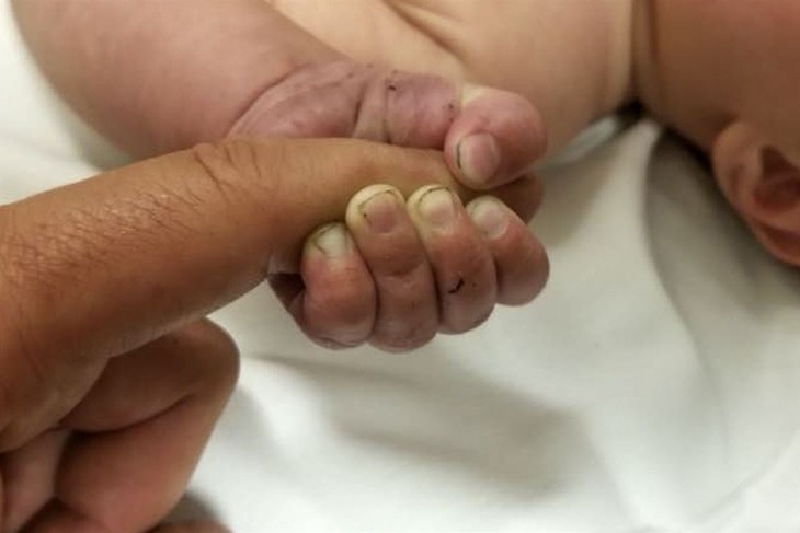 This Sunday, July 8, 2018 photo provided by the Missoula County Sheriff’s Office shows a 5-month-old infant with dirt under their fingernails after authorities say the baby survived about nine hours being buried under sticks and debris in the woods. The Missoula County Sheriff’s Office says the baby is in good condition at a hospital and calls it a “miracle” that the child survived the weekend ordeal. Authorities say they were called about a man threatening people in the Lolo Hot Springs area of western Montana’s Lolo National Forest. Deputies apprehended the man who indicated that the baby was buried somewhere in the woods. (Missoula County Sheriff’s Office via AP)