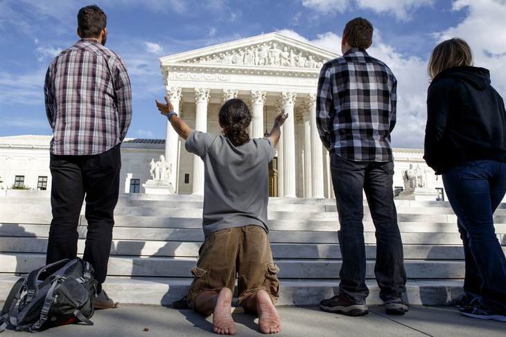 FILE – In this Oct. 4, 2014 file photo, as the U.S. Supreme Court begins its new term this week, pro-life advocates hold a prayer vigil on the plaza of the high court in Washington, Saturday, Oct. 4, 2014. The group, Bound 4 Life, has come to the court for ten years to make a silent appeal against abortion. Abortions have declined in states where new laws make it harder to have them – but they’ve also waned in states where abortion rights are protected, an Associated Press survey finds. Nearly everywhere, in red states and blue, abortions are down since 2010.(AP Photo/J. Scott Applewhite, File)