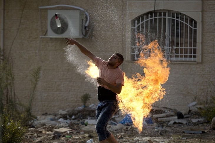 Palestinians throw molotov cocktail during clashes with Israeli troops near Ramallah, West Bank, Monday, Oct. 12, 2015. Recent days have seen a series of stabbing attacks in Israel and the West Bank that have wounded several Israelis. Past weeks have also seen violent demonstrations in the West Bank and Gaza, and at least 16 Palestinians have been killed by Israeli forces. (AP Photo/Majdi Mohammed)