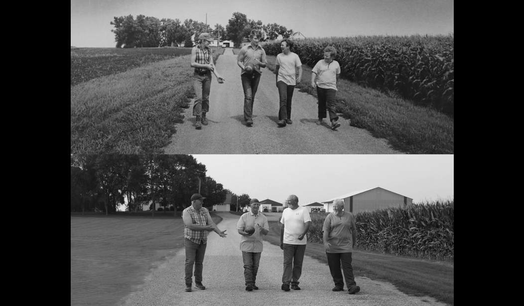 UPDATE: Since my FitzSimmons visit, the parents have passed away. The brothers and sisters married, and their children are now marrying. They’ve grown the family agri-business immensely. Our families became enduring friends, and as a memento, last year Megan Hollerich Schwanz, a niece of Dick’s, re-staged the photo above from my visit on the same dirt driveway in the same poses.