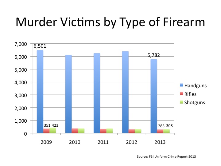 In addition, despite the fact we hear a lot about the need to control assault rifles, the reality is that rifles of any type are rarely used to kill anyone in the United States. There were only 285 murders committed with a rifle in 2013. That is down 19% since Obama took office. Handguns were used 5,782 times.