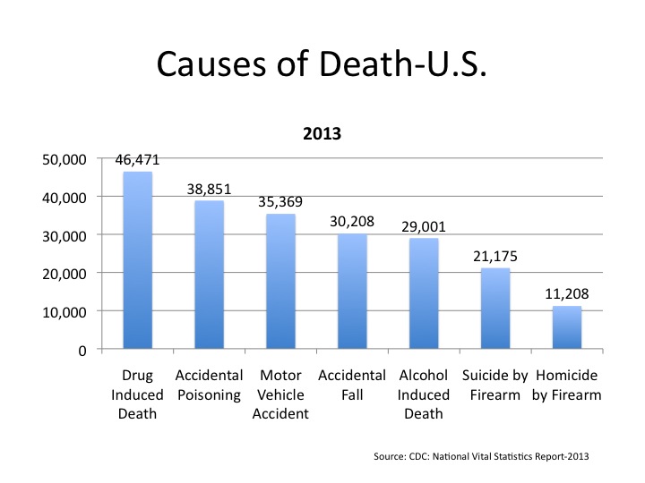 Homicides caused by guns is not even close to other causes of death including drugs, poisoning, motor vehicle accidents, falls and alcohol. For example, there are over 4 times as many deaths by drugs as there are homicides by guns.