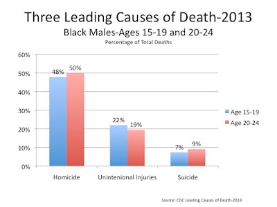 In fact, in 2013, almost 50% of the deaths of young, black males between 15 and 24 years of age were the result of homicide. The comparable number for young white males of the same age—8%.