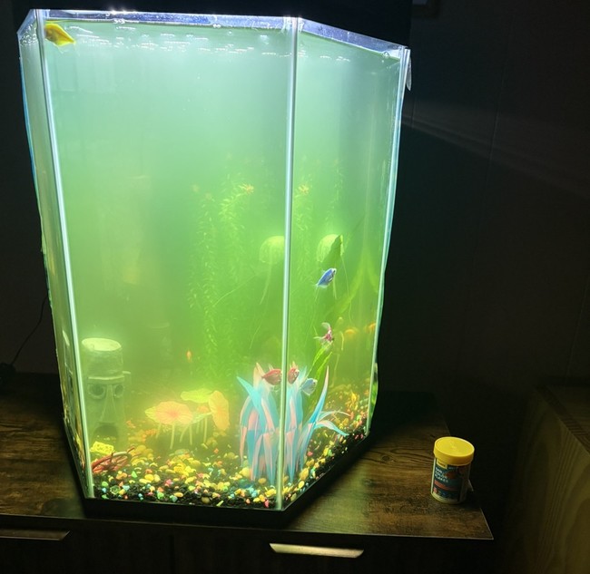 Since that time, I’ve spent far too much time googling what could cause such a thing and what to do about it. I’ve bought algae-killer, water clarifier—you name it. At one point, endless failure was starting to get to me, so I did the only thing I thought might solve the problem: the nuclear option. I emptied virtually the entire 20-gallon tank – which is a lot more water than it might sound like—and rebuilt everything from scratch. This is not recommended (understatement), as the shock and altered chemistry can cause all the fish to die. Luckily for me, most survived the ordeal and voila! There was my beauteous, bright tank—reanimated.
