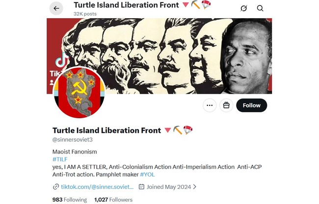 The Turtle Island Liberation Front describes itself on Facebook as a political organization that seeks "liberation of occupied Turtle Island and liberation of all colonized people across the world." The group has expressed pro-Palestinian messages on social media and has said it is fighting against "fascist colonizers." It has urged followers to bring Palestinian flags to protests.