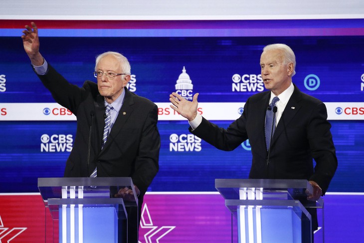 From left, Democratic presidential candidates, Sen. Bernie Sanders, I-Vt., and former Vice President Joe Biden, participate in a Democratic presidential primary debate at the Gaillard Center, Tuesday, Feb. 25, 2020, in Charleston, S.C., co-hosted by CBS News and the Congressional Black Caucus Institute. (AP Photo/Patrick Semansky)