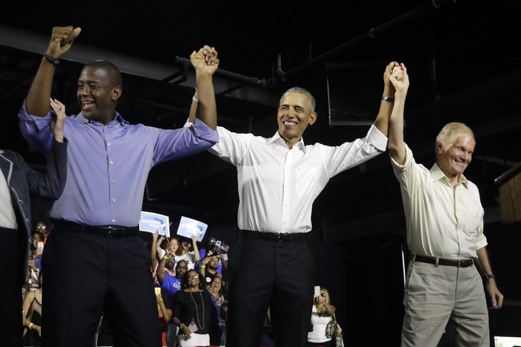 Former President Barack Obama, center, raises arms with Democratic gubernatorial candidate Andrew Gillum, left, and U.S. Sen. Bill Nelson, D-Fla., right, during a campaign rally, Friday, Nov. 2, 2018, in Miami. (AP Photo/Lynne Sladky)
