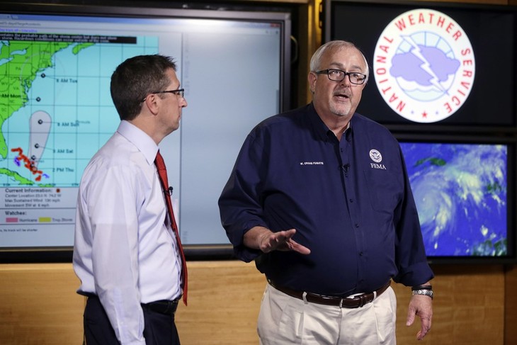 FILE- In this Oct.1, 2015 file photo, Craig Fugate, Administrator of the Federal Emergency Management Agency (FEMA), right, talks about the status of Hurricane Joaquin as it moves through the eastern Bahamas as Rick Knabb, Director of the National Hurricane Center, left, participate in a media briefing at the National Hurricane Center. The U.S. government is set to release its forecast for how many hurricanes and tropical storms are expected to form over Atlantic and Caribbean waters in the next six months. It’s an annual reminder from the National Oceanic and Atmospheric Administration that coastal living comes with significant risks. (AP Photo/Lynne Sladky, File)