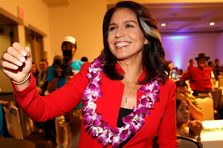 Rep. Tulsi Gabbard, D-Hawaii, greets supporters Tuesday, Nov. 6, 2018, in Honolulu. (AP Photo/Marco Garcia)
