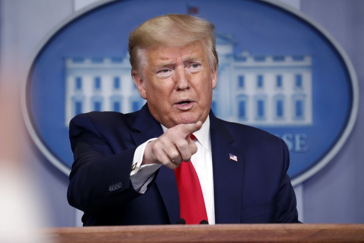 President Donald Trump speaks about the coronavirus in the James Brady Press Briefing Room of the White House, Thursday, April 9, 2020, in Washington. (AP Photo/Andrew Harnik)