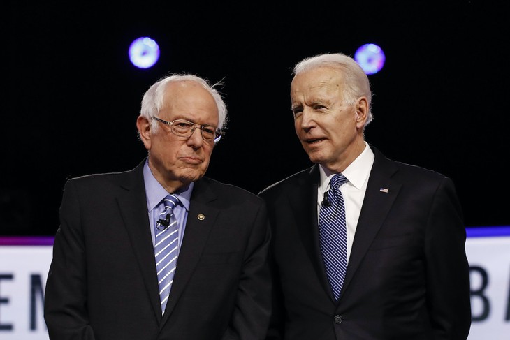 From left, Democratic presidential candidates, Sen. Bernie Sanders, I-Vt., former Vice President Joe Biden, talks before a Democratic presidential primary debate, Tuesday, Feb. 25, 2020, in Charleston, S.C. (AP Photo/Matt Rourke)