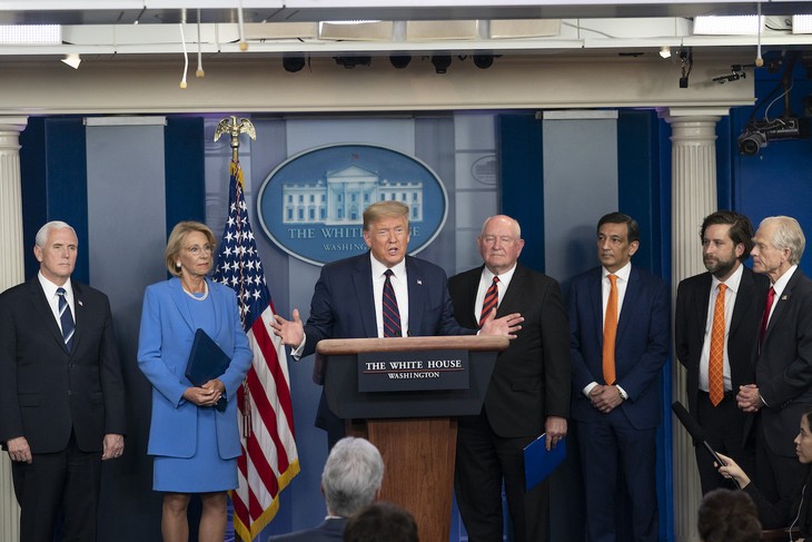 President Donald J. Trump and Vice President Mike Pence, joined by Secretary of Education Betsy Devos, left, and Secretary of Agriculture Sonny Perdue and members of the White House Coronavirus Task Force, delivers his remarks at a coronavirus (COVID-19) update briefing Friday, March 27, 2020, in the James S. Brady Press Briefing Room of the White House. (Official White House Photo by Joyce N. Boghosian)