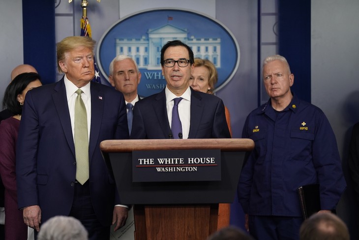 Treasury Secretary Steven Mnuchin speaks during a press briefing with the coronavirus task force, at the White House, Tuesday, March 17, 2020, in Washington, as President Donald Trump looks on. (AP Photo/Evan Vucci)