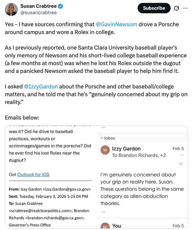 Five days later, Crabtree revealed that when she contacted Newsom's press office to ask for clarification of his Santa Clara University baseball career, Newsom spokesperson Izzy Gardon replied, "I'm genuinely concerned about your grip on reality here, Susan. These questions belong in the same category as alien-abduction theories."