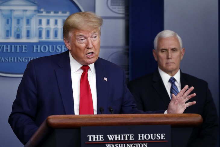 President Donald Trump speaks about the coronavirus in the James Brady Press Briefing Room of the White House, Friday, April 3, 2020, in Washington, as Vice President Mike Pence listens. (AP Photo/Alex Brandon)