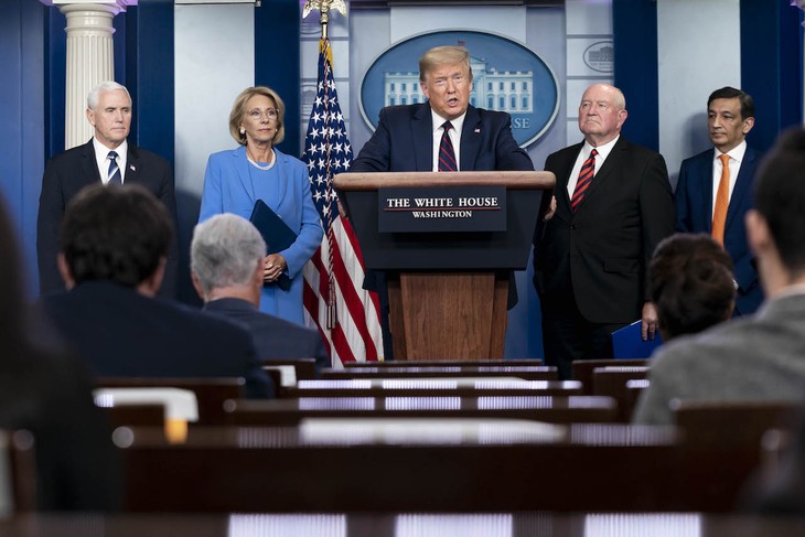 President Donald J. Trump and Vice President Mike Pence, joined by Secretary of Education Betsy Devos, left, and Secretary of Agriculture Sonny Perdue and members of the White House Coronavirus Task Force, delivers his remarks at a coronavirus (COVID-19) update briefing Friday, March 27, 2020, in the James S. Brady Press Briefing Room of the White House. (Official White House Photo by Andrea Hanks)