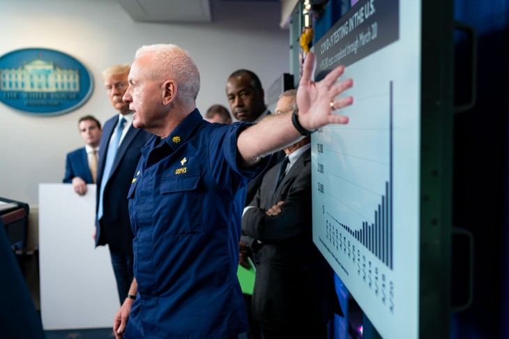 President Donald J. Trump and members of the White House Coronavirus Task Force look on as Assistant Secretary for Health Adm. Brett Giroir, M.D. delivers remarks during a coronavirus update briefing Saturday, March 21, 2020, in the James S. Brady Press Briefing Room of the White House. (Official White House Photo by Tia Dufour)
