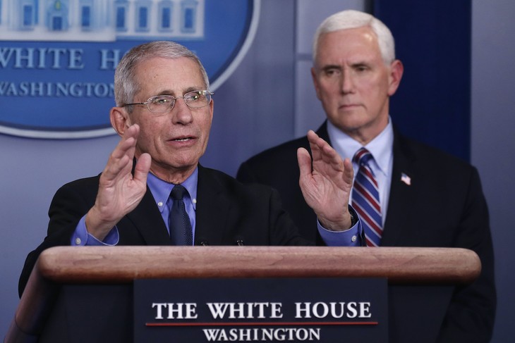 Dr. Anthony Fauci, director of the National Institute of Allergy and Infectious Diseases, speaks about the coronavirus in the James Brady Briefing Room, Thursday, March 26, 2020, in Washington, as Vice President Mike Pence listens. (AP Photo/Alex Brandon)