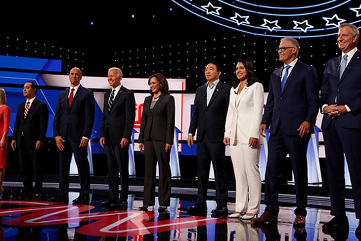 From left, Sen. Michael Bennet, D-CO, Sen. Kirsten Gillibrand, D-NY, former HUD Sec. Julian Castro, Sen. Cory Booker, D-NJ., former VP Joe Biden, Sen. Kamala Harris, D-CA, Andrew Yang, Rep. Tulsi Gabbard, D-HI, Washington Gov. Jay Inslee and NYC Mayor Bill de Blasio, July 31, 2019, in the Fox Theatre in Detroit. (AP Photo/Carlos Osorio)