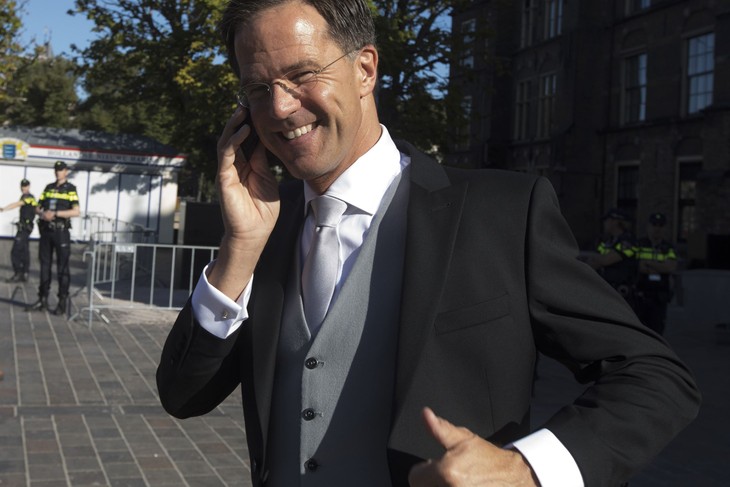 Dutch Prime Minister Mark Rutte flashes a thumbs up as he talks on in his phone in The Hague, Netherlands, Tuesday, Sept. 18, 2018, prior to a ceremony marking the opening of the parliamentary year with a speech by King Willem-Alexander outlining the government’s budget plans for the year ahead. (AP Photo/Peter Dejong)