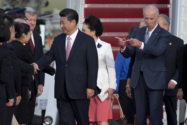 Vice President Joe Biden gestures toward Chinese President Xi Jinping and his wife Peng Liyuan during an arrival ceremony in Andrews Air Force Base, Md., Thursday, Sept. 24, 2015. Chinese President Xi Jinping and his wife Peng Liyuan are traveling to Washington for a State Visit. (AP Photo/Carolyn Kaster)