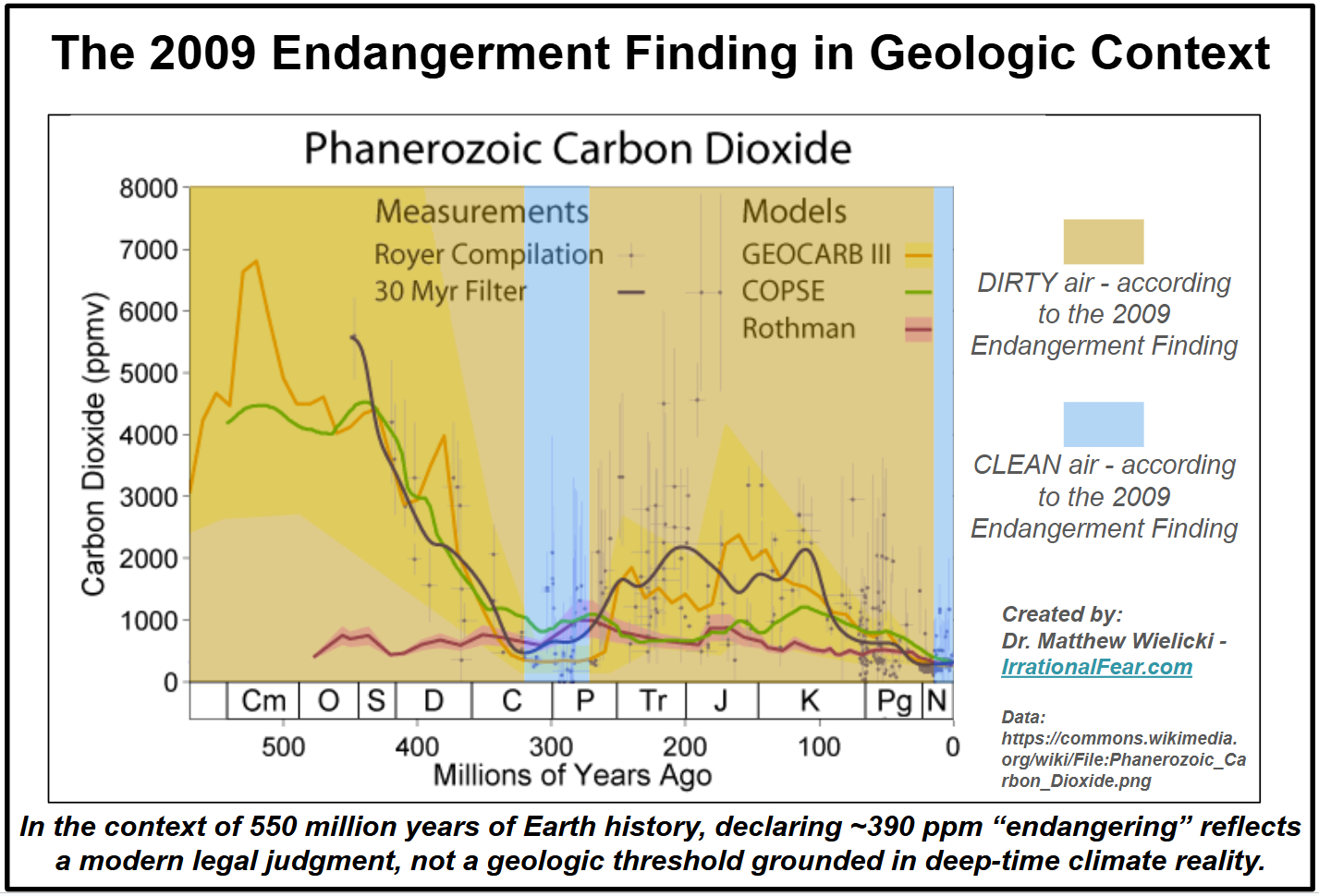 In The Endangerment Finding Was Pre-Cooked, I walked through the Phanerozoic reconstruction of atmospheric CO2. Over the last 550 million years, concentrations frequently exceeded 1000 parts per million and at times reached several thousand.